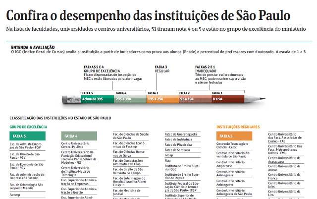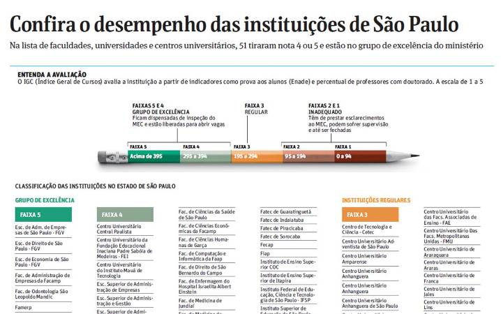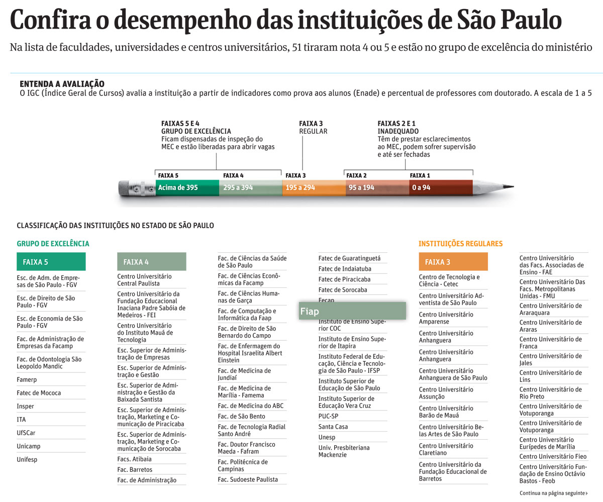 O MEC acaba de divulgar o ranking das escolas considerando o IGC (Índice Geral dos Cursos), onde a FIAP classifica-se no “GRUPO DE EXCELÊNCIA”. Na lista de faculdades, universidades e centros universitários, somente 51 estão neste grupo.