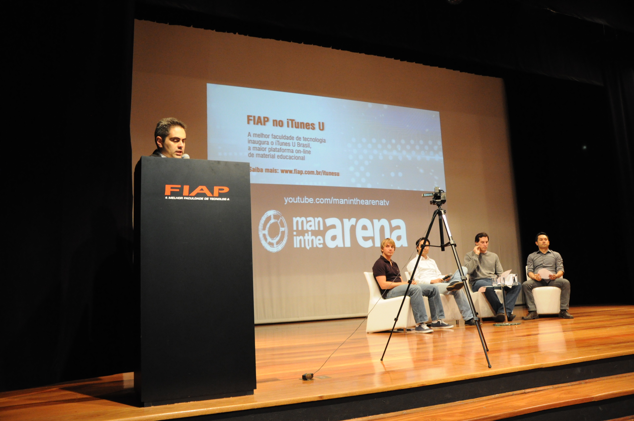 Um anfiteatro lotado por alunos de oito salas da FIAP, entre Administração, Análise e Desenvolvimento de Sistemas e Sistemas da Informação, recebeu os apresentadores do videocast Man in the Arena, Leo Kuba e Miguel Cavalcanti, para a gravação dos 36º e 37º episódios do canal. Os convidados da noite foram os Co-country Managers da AirBnB Brasil, Christian Gessner e Stefan Schimenes, e o Cofundador e CTO do Kekanto, Bruno Yoshimura.