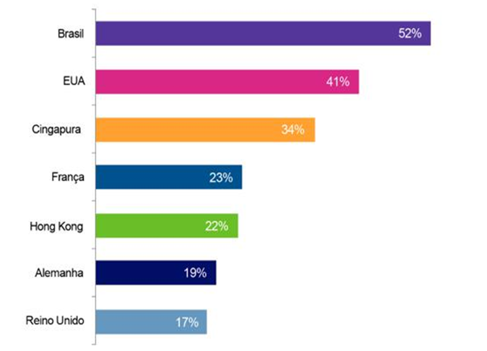 No Brasil, 50% dos executivos de TI pensam que a administração das empresas em que atuam reconhecem a importância da cyber segurança, indicando que responsabilidade e consciência são compartilhados de forma mais eficaz. A porcentagem de administrações que subestimam a importância da segurança é maior nos demais países, chegando a 68% em Hong Kong e 64% na França.