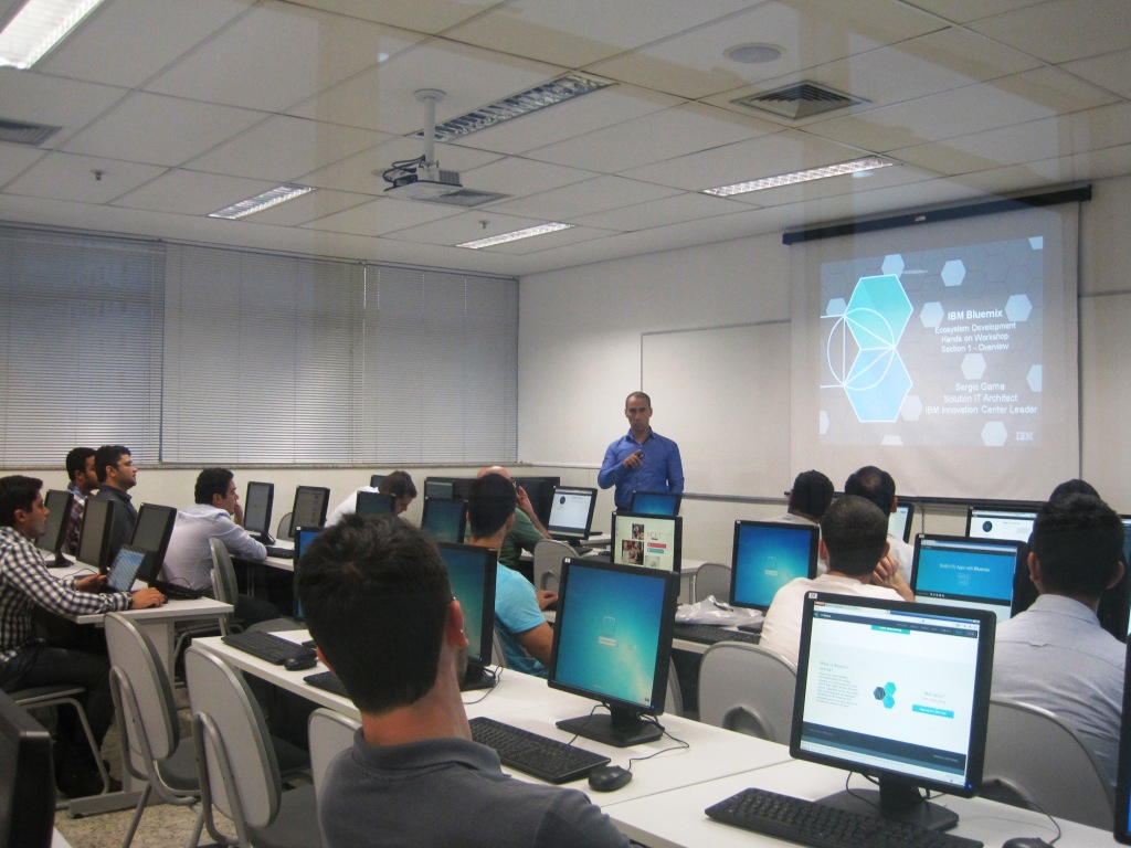 A IBM apresentou a plataforma Bluemix para os alunos da FIAP durante uma oficina especial em primeiro de dezembro. Trata-se de uma plataforma em cloud para ambiente de deploy, utilizada para o desenvolvimento, homologação e produção de aplicativos. “A vantagem de usar a plataforma Bluemix é que você não precisa comprar equipamento, nem licença e nem pagar para o fornecedor fazer manutenção no seu ambiente. Você já tem um ambiente montado na nuvem em minutos” explicou o arquiteto de software da IBM e ministrante da oficina, Sérgio Gama.