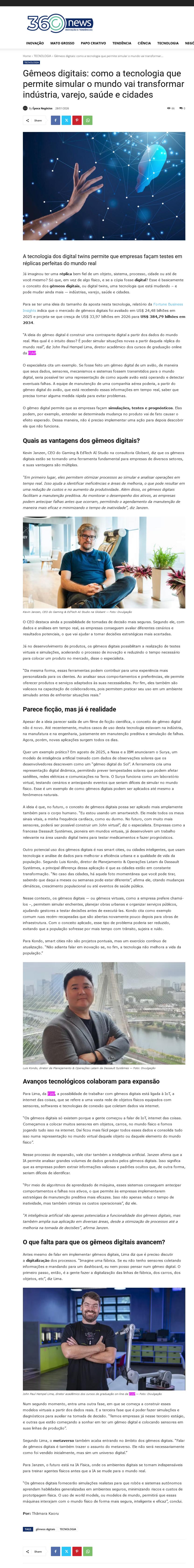 360 News – NOTÍCIAS (GEMEOS DIGITAIS: COMO A TECNOLOGIA QUE PERMITE SIMULAR O MUNDO VAI TRANSFORMAR INDUSTRIA, VAREJO, SAUDE E CIDADES – JOHN PAUL LIMA)