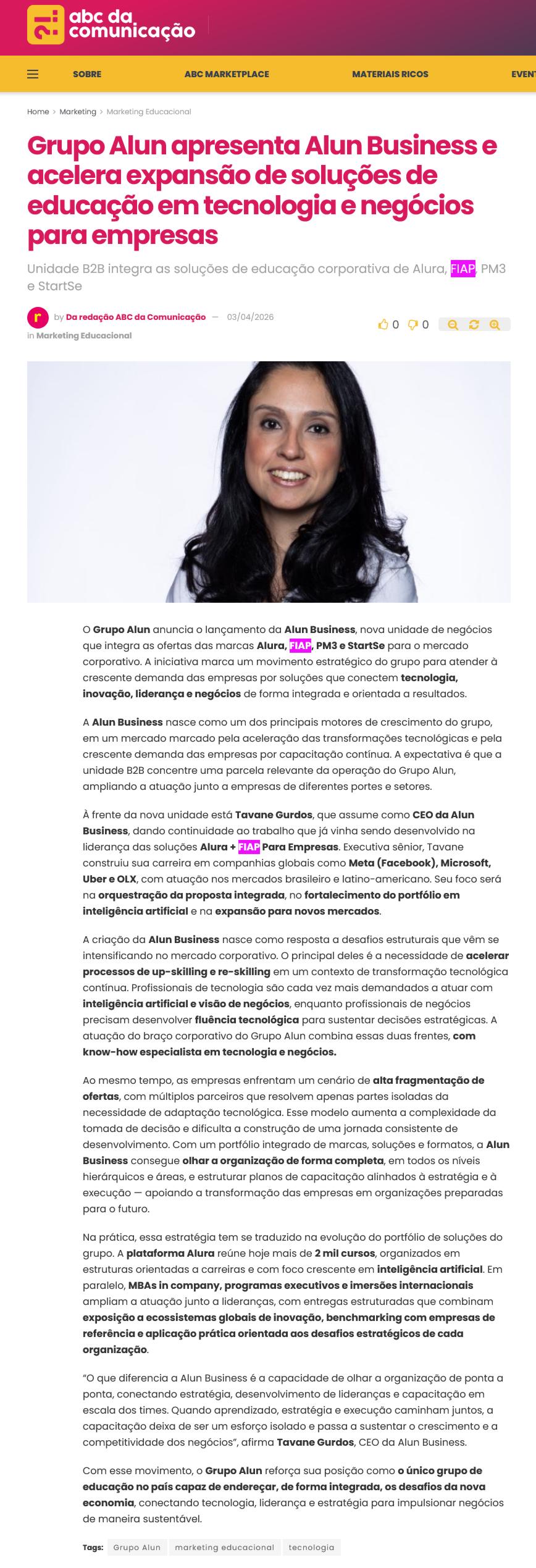 ABC da Comunicação – NOTÍCIAS (GRUPO ALUN APRESENTA ALUN BUSINESS E ACELERA EXPANSAO DE SOLUCOES DE EDUCACAO EM TECNOLOGIA E NEGOCIOS PARA EMPRESAS – FIAP)