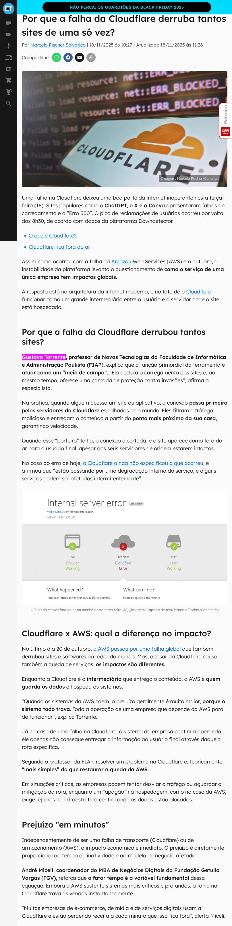 Canal Tech – NOTÍCIAS (POR QUE A FALHA DA CLOUDFLARE DERRUBA TANTOS SITES DE UMA SO VEZ? – GUSTAVO TORRENTE)