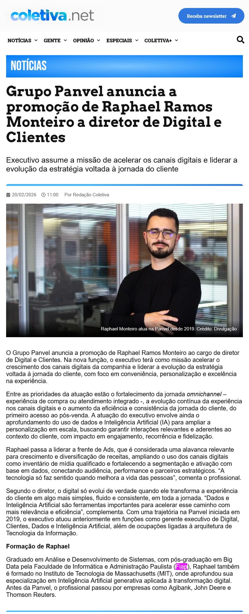 Coletiva Net – NOTÍCIAS (GRUPO PANVEL ANUNCIA A PROMOCAO DE RAPHAEL RAMOS MONTEIRO A DIRETOR DE DIGITAL E CLIENTES – ALUNOS)