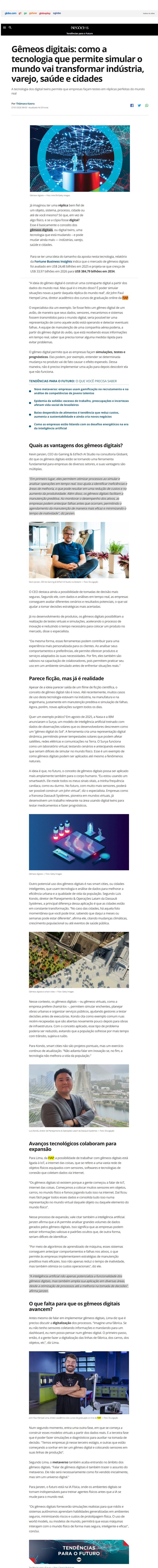 Época Negócios – NOTÍCIAS (GEMEOS DIGITAIS: COMO A TECNOLOGIA QUE PERMITE SIMULAR O MUNDO VAI TRANSFORMAR INDUSTRIA, VAREJO, SAUDE E CIDADES – JOHN PAUL LIMA)