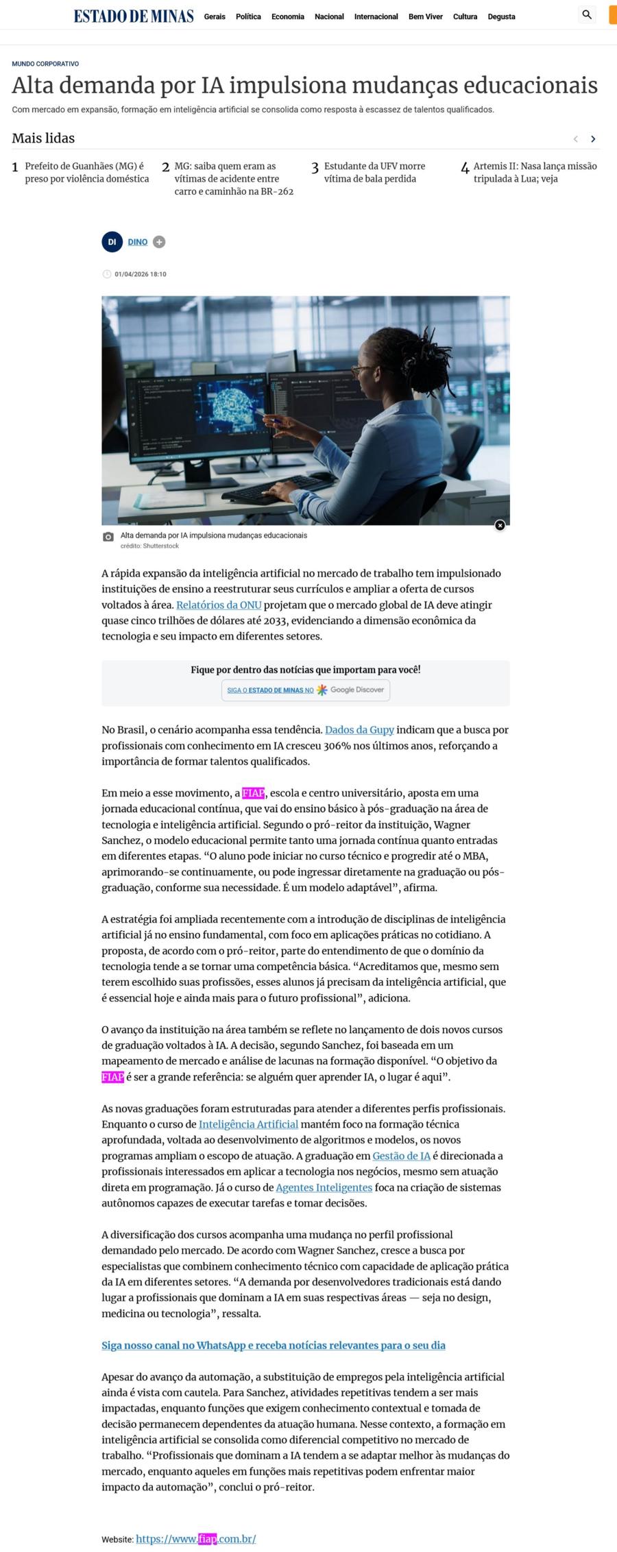 ESTADO DE MINAS E MAIS 161 PORTAIS – NOTÍCIAS (Alta demanda por IA impulsiona mudanças educacionais – WAGNER SANCHEZ)