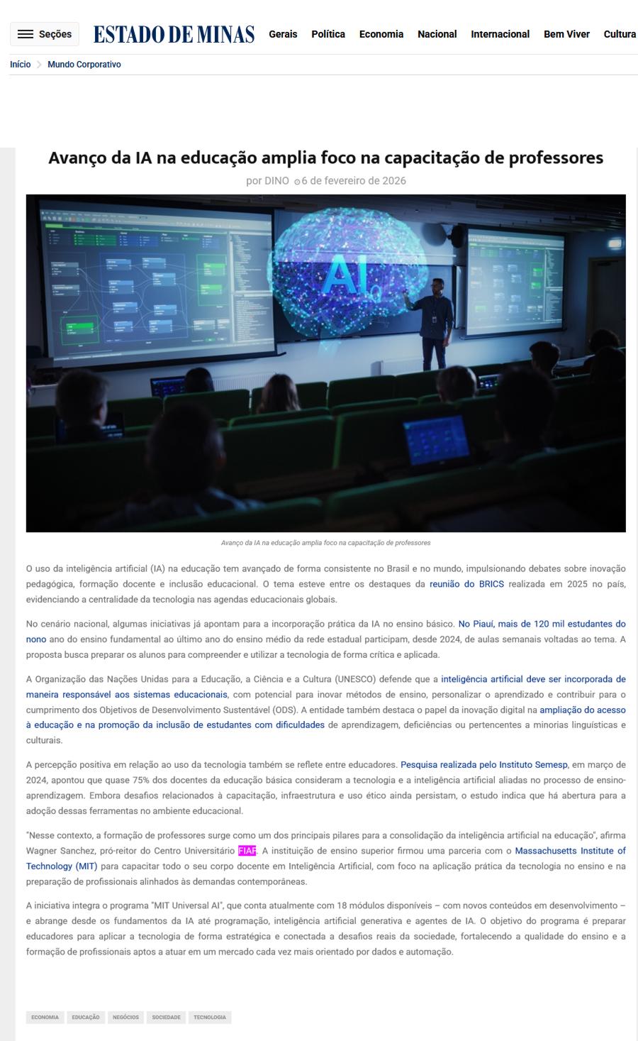 ESTADO DE MINAS E MAIS 172 PORTAIS – NOTÍCIAS (AVANCO DA IA NA EDUCACAO AMPLIA FOCO NA CAPACITACAO DE PROFESSORES – FIAP)