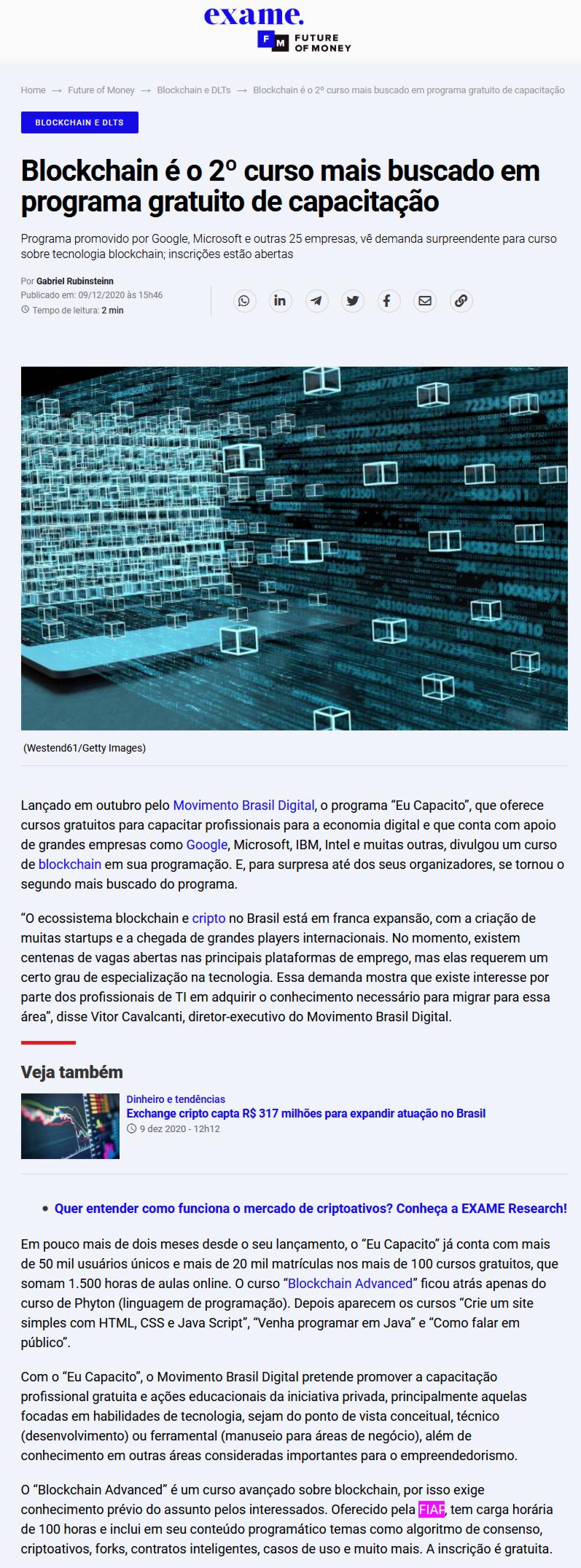 EXAME – NOTÍCIAS (BLOCKCHAIN É O 2º CURSO MAIS BUSCADO EM PROGRAMA GRATUITO DE CAPACITAÇÃO – FIAP)
