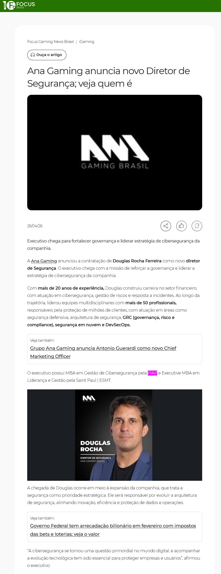 Focus Brasil – NOTÍCIAS (ANA GAMING ANUNCIA NOVO DIRETOR DE SEGURANCA; VEJA QUEM E – ALUNOS)