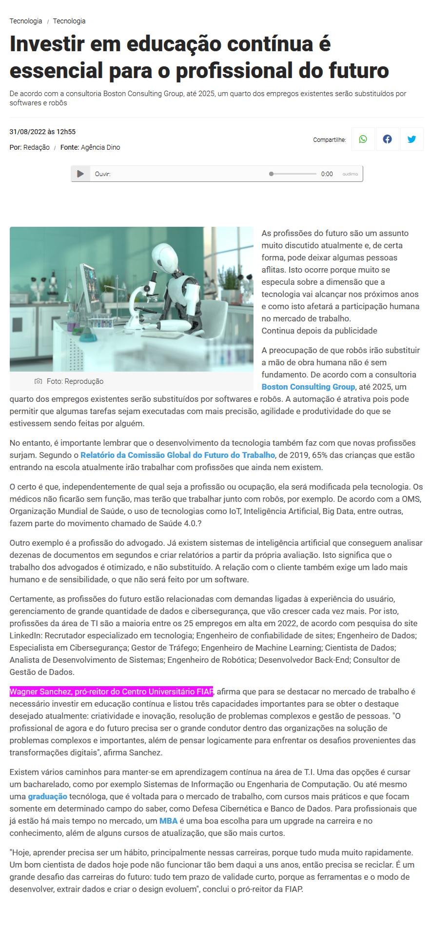 Wagner Sanchez, Coordenador Acadêmico do MBA em Health Tech da FIAP e Diretor dos cursos de Graduação, falou sobre como se destacar no mercado de trabalho do futuro. Matéria publicada no portal Interage Goiânia.