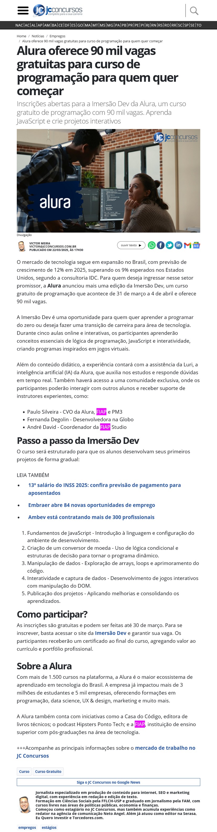 JC Concursos – NOTÍCIAS (ALURA OFERECE 90 MIL VAGAS GRATUITAS PARA CURSO DE PROGRAMAÇÃO PARA QUEM QUER COMEÇAR – ANDRÉ DAVID)