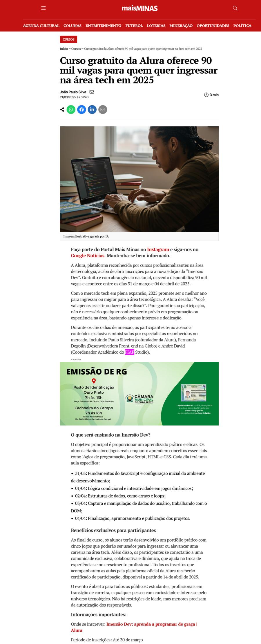 Mais Minas – NOTÍCIAS (CURSO GRATUITO DA ALURA OFERECE 90 MIL VAGAS PARA QUEM QUER INGRESSAR NA ÁREA TECH EM 2025 – ANDRÉ DAVID)