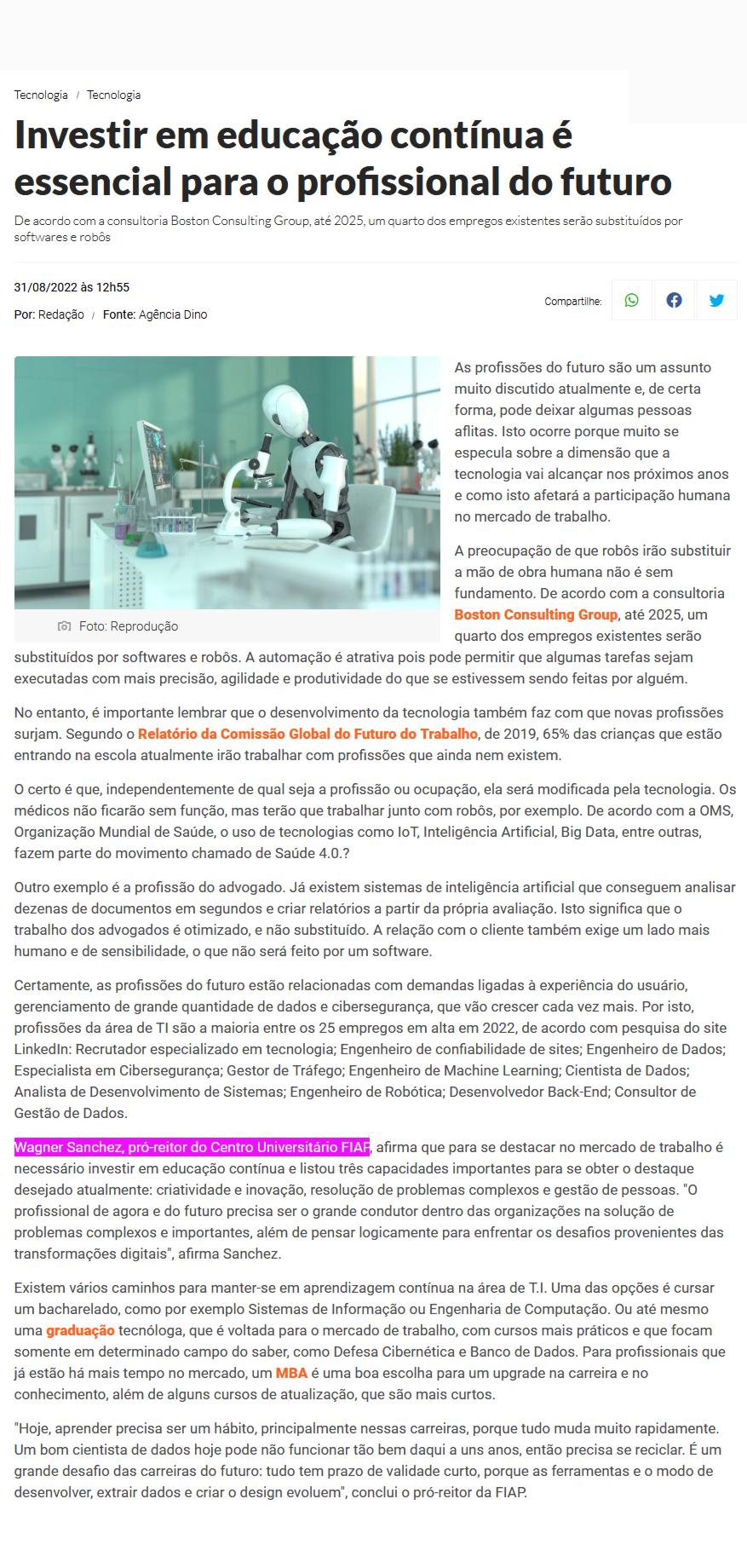 Wagner Sanchez, Coordenador Acadêmico do MBA em Health Tech da FIAP e Diretor dos cursos de Graduação, falou sobre como se destacar no mercado de trabalho do futuro. Matéria publicada no portal Morato Hoje.