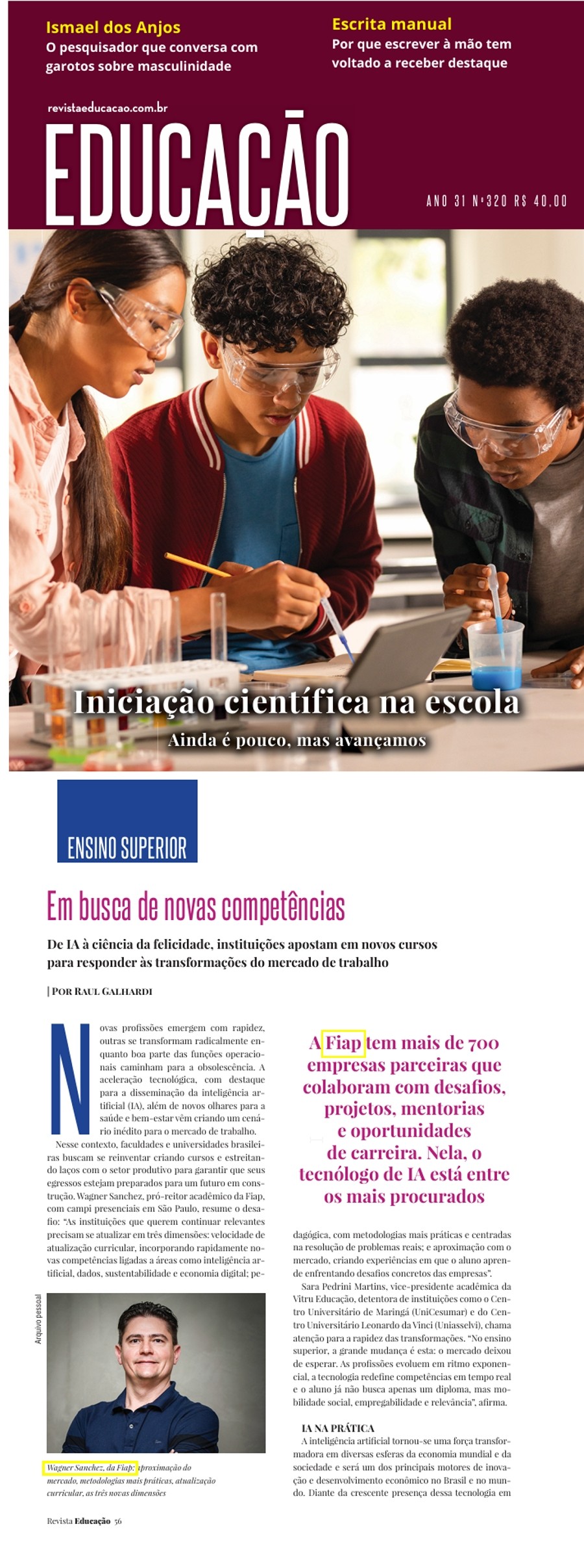 Wagner Sanchez, pró-reitor do Centro Universitário FIAP, foi entrevistado pela Revista Educação. Matéria publicada na edição n°320, seção Ensino Superior, páginas 56 a 58.