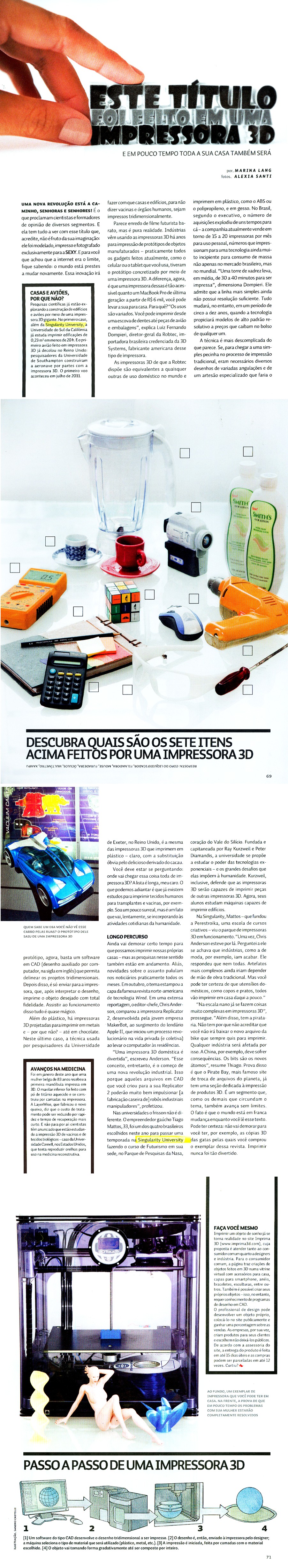 Avanços nos estudos sobre impressão 3D são publicados pela Revista Sexy e Singularity University é citada como referência.