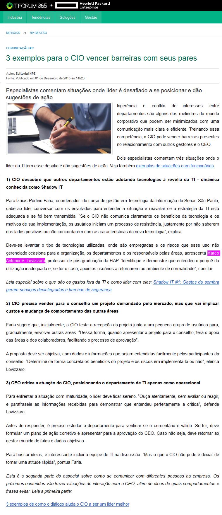 Site IT Forum 365 – Notícias ( 3 EXEMPLOS PARA O CIO VENCER BARREIRAS COM SEUS PARES – Marco Antonio)