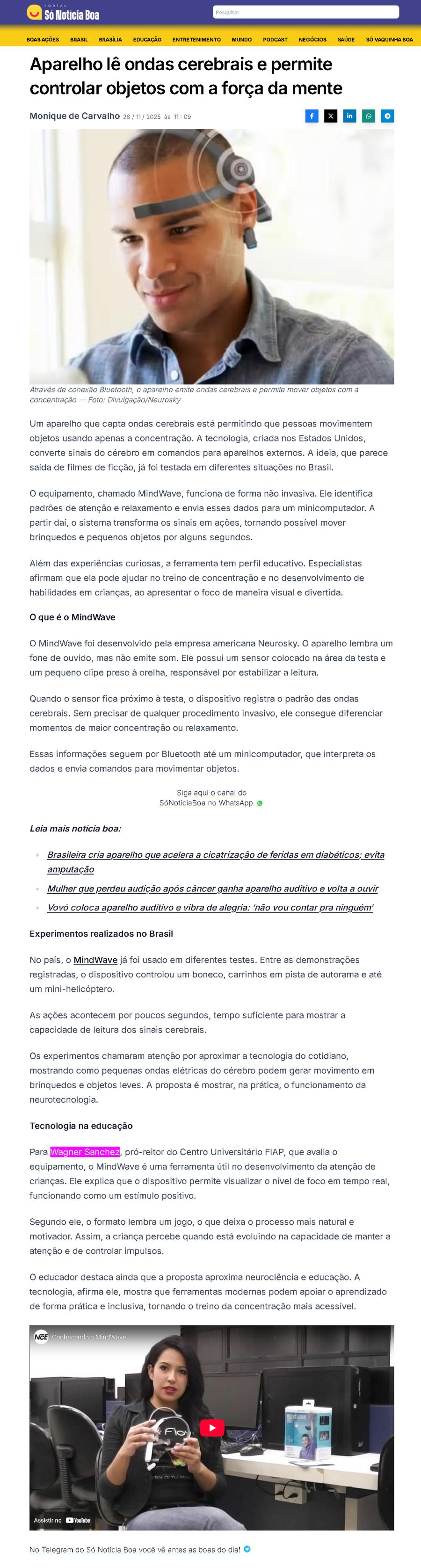 Só Notícia Boa – NOTÍCIAS (APARELHO LE ONDAS CEREBRAIS E PERMITE CONTROLAR OBJETOS COM A FORCA DA MENTE – WAGNER SANCHEZ)