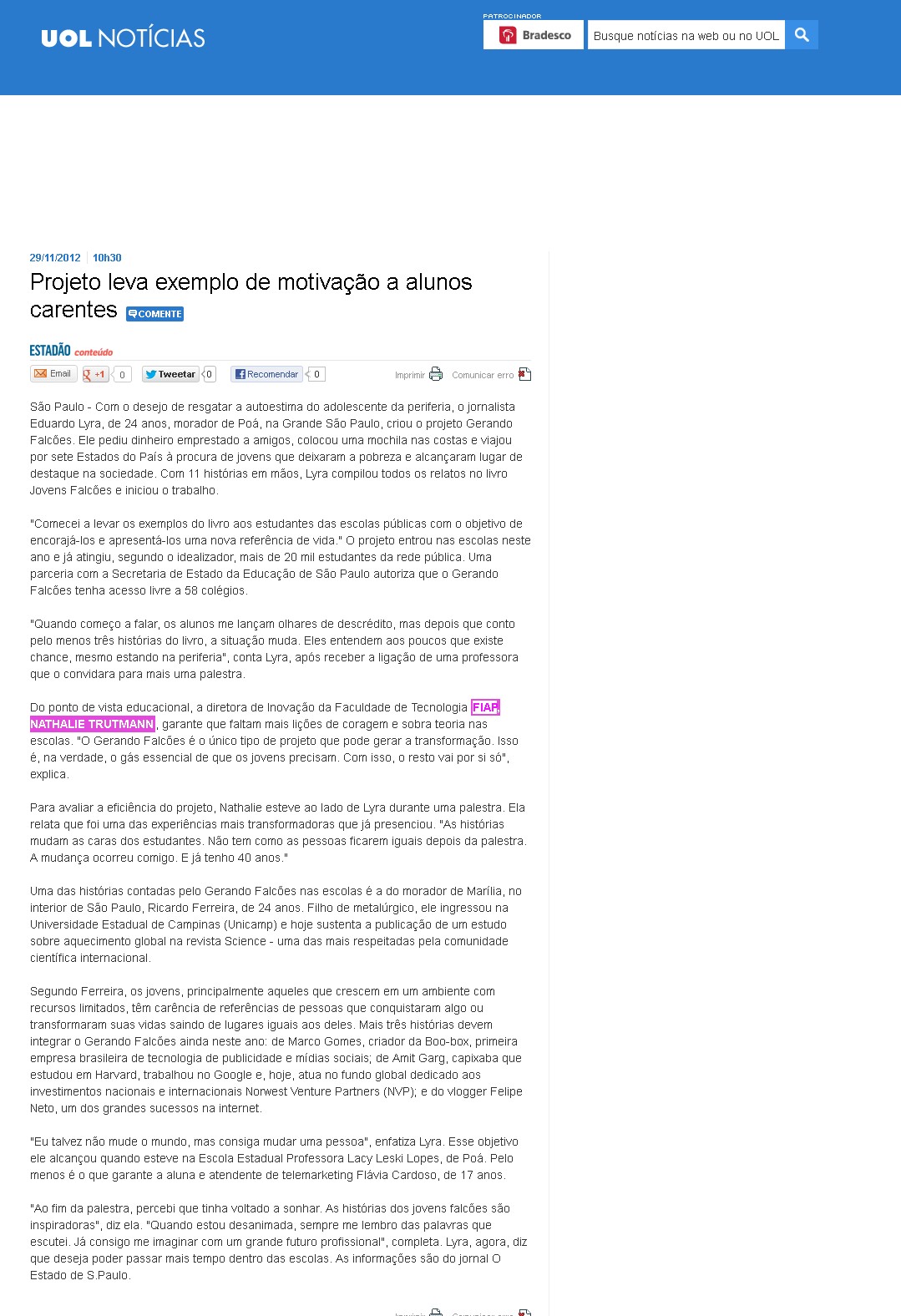 UOL Notícias – Últimas Notícias (Projeto leva exemplo de motivação a alunos carentes – FIAP)