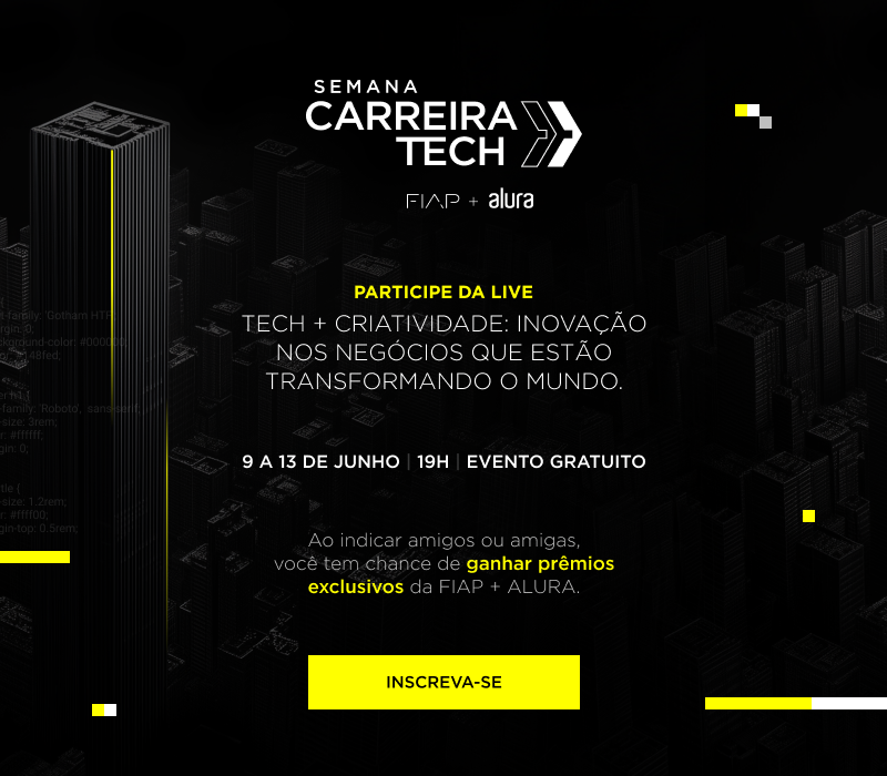 É uma das trilhas em destaque do dia 11 de junho da Semana Carreira Tech. Especialistas da FIAP, Alura e parceiros de mercado mostrarão como novas soluções nascem da interseção entre design, dados e estratégia.